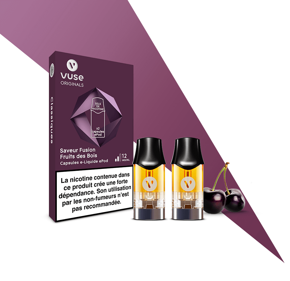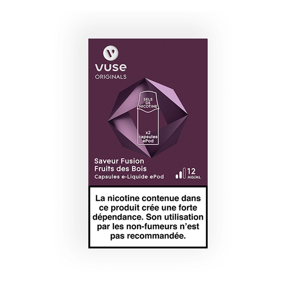Le pack de deux capsules epod Fusion Fruits des Bois Vuse est un succulent mélange de fruits des bois rehaussé d’une pointe de vanille. Les deux recharges de 1.9ml chacune epod vuse / vype fruits des bois sont faites exclusivement pour la cigarette électronique vuse ou vype Epod. Vype a changé de nom pour devenir Vuse : nouveau logo, nouveau nom, nouveau design et même saveur et bien sur 100% compatible. Les recharges Vype vont sur un epod Vuse et vice versa. Elles existent en différentes saveurs :