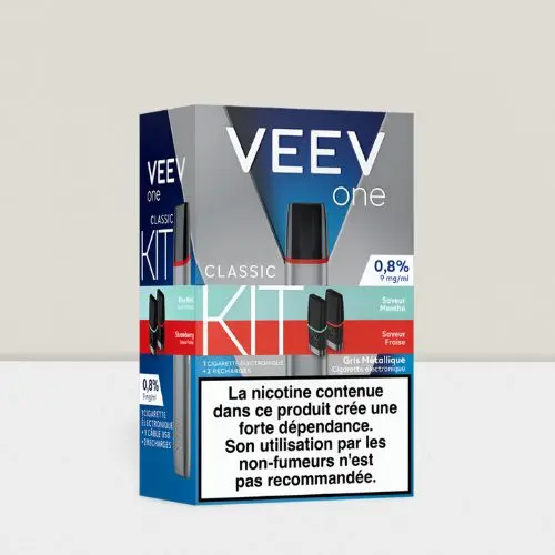 Le kit VEEV One contient une cigarette électronique VEEV One gris métallisé et 2 recharges 9 mg/ml (Menthe et Fraise).